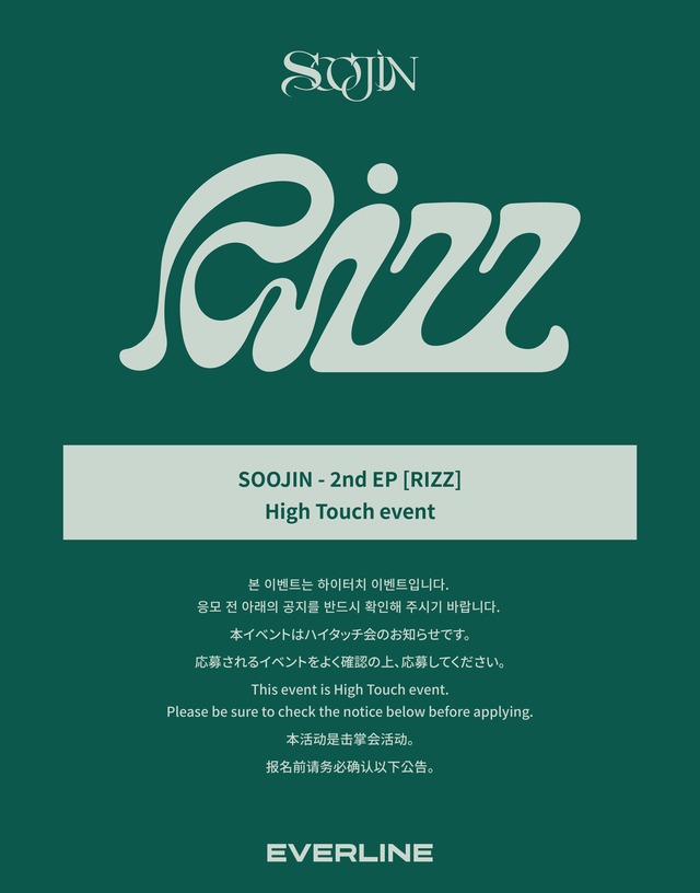 SOOJIN - 2nd EP [RIZZ] (RANDOM) ※日本東京で7月12日金曜日に行われる対面サイン会イベント商品で、3枚セット商品です。イベント商品は購入後のキャンセルは不可のため、ご確認の上、購入してください。必ず、現場の参加が可能な方のみ応募をお願いいたします。 ※7月7日23時59分まで入金処理ができた方が応募対象になります。 この時間を過ぎますと応募対象になりません。 * アップデートされたお知らせ画像もご確認ください。 * このイベントの特典フォトカードはエバーライン限定イメージです。 * 特典の場合、贈呈用として支給される商品のため、交換/返品が不可となります。 * フォトカードは、ご購入いただいたアルバム枚数と同様に贈呈されます。 ※ アルバムはイベント終了後に発送されます。(出荷までに3週間以上かかる場合があります。)。ご了承ください.) ※ アルバムバージョン選択不可 / ランダム発送 / ポスターはプレゼントされません。 ※ イベント応募期間内にご購入いただいたアルバムは自動応募となりますので、キャンセル及び払い戻しはできません。(週末及び祝日のお問い合わせは致しかねます。) [Precautions for entering event applicant information] NAME : Applicant's name (English)名(英文) BIRTH : YYMMDD (ex.001231) PHONE NUMBER : Applicant's contact phone number (including country code) EMAIL : Email address where the winner’s email can be received *本イベントはご注文時に記入していただくイベント応募情報をもとに応募が行われます。 *본 이벤트는 주문 시 기입해주시는 이벤트 응모 정보를 토대로 응모가 진행됩니다. *Entry for this event will be based on the event application information provided when ordering. *本次活动以下单时填写的活动应募信息为基础进行应募。 *海外居住者の場合、配送代行先または他人の連絡先ではなく、 ご本人の連絡先を国家番号を含めて必ずご記載ください。 *외국 거주자의 경우 배송대행지 또는 타인의 연락처가 아닌 본인의 연락처를 국가번호를 포함하여 반드시 기재해주십시오. *If you live abroad, be sure to enter your own contact information, including the country code, not the delivery agency or someone else's contact information. *外国居住者请务必填写本人的联系方式,包括国际区号,而不是配送代理地或他人的联系方式。 *連絡が取れない連絡先を記載して発生した不利益については責任を負いかねます。 *연락이 되지 않는 연락처를 기재하여 발생한 불이익에 대해서는 책임지지 않습니다. *We are not responsible for any disadvantages caused by entering unreachable contact information. *对于填写无法联系的联系方式而发生的损失, 将由本人承担 。 *応募の際には必ず正確な情報を入力してください。 *응모 시 반드시 정확한 정보를 입력해 주시기 바랍니다. *Please be sure to enter accurate information when applying. *应募时请务必输入正确的信息。 *ニックネームでの応募はできません。 英語の実名で応募及び参加をお願いします。 *닉네임으로 응모는 불가합니다. 영어 실명으로 응모 및 참여 부탁드립니다. *You cannot apply with a nickname. Please apply and participate using your real name in English. *不能以昵称报名。 请用英语实名报名并参与。 *電話番号入力時、ハイフン(-)の有無は応募及び合算に影響を与えません。 *전화번호 입력 시 하이픈(-) 유무는 응모 및 합산에 영향을 끼치지 않습니다. *The presence or absence of a hyphen (-) when entering a phone number does not affect application or summation. *输入电话号码时, 是否有填写连字符(-)都不会对应募及合算产生影响。 [Event Notice] *下記のイベントの注意事項を熟知した上、イベントにご参加ください。 また、現場のスタッフのリクエストにご協力お願いいたします。 *하기의 이벤트 유의 사항을 숙지하시고 이벤트에 참여해 주시기 바라며, 현장 스태프들의 요청에 협조 부탁드립니다. *Please be aware of the following event precautions and participate in the event, and please cooperate with the on-site staff's requests. *请熟知以下活动注意事项,并参与活动,请协助现场工作人员的要求。 *本イベントは日本で行われるイベントです。 現場参加が可能な方のみご応募ください。 *본 이벤트는 일본에서 진행되는 이벤트입니다. 현장 참여가 가능하신 분만 응모 부탁드립니다. *This event is held in Japan. Please apply only if you are able to participate on-site. *本次活动是在日本进行的活动。 务必请可以亲自到场参与的人报名。 · 구매하신 앨범들 중 당첨자의 경우 대면 팬사인회 현장에 필요한 1장을 제외하여 발송됩니다. 사인받으실 앨범은 당일 팬사인회 현장에서 준비하여 드릴 예정입니다. *イベント開始1時間前まで現地に到着をお願いいたします。 中途入場または参加時間の変更は、現場の状況によって難しい場合がありますので、ご注意願います。 *행사 시작 1시간 전까지 현장에 도착해주시기 바랍니다. 중도입장 또는 참여시간 변경은 현장 상황에 따라 어려울 수 있으니 이 점 유의하시기 바랍니다. *Please arrive at the site 1 hour before the event starts. Please note that mid-entry or change of participation time may be difficult depending on the on-site situation. *请在活动开始前1小时到达现场。 