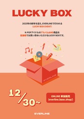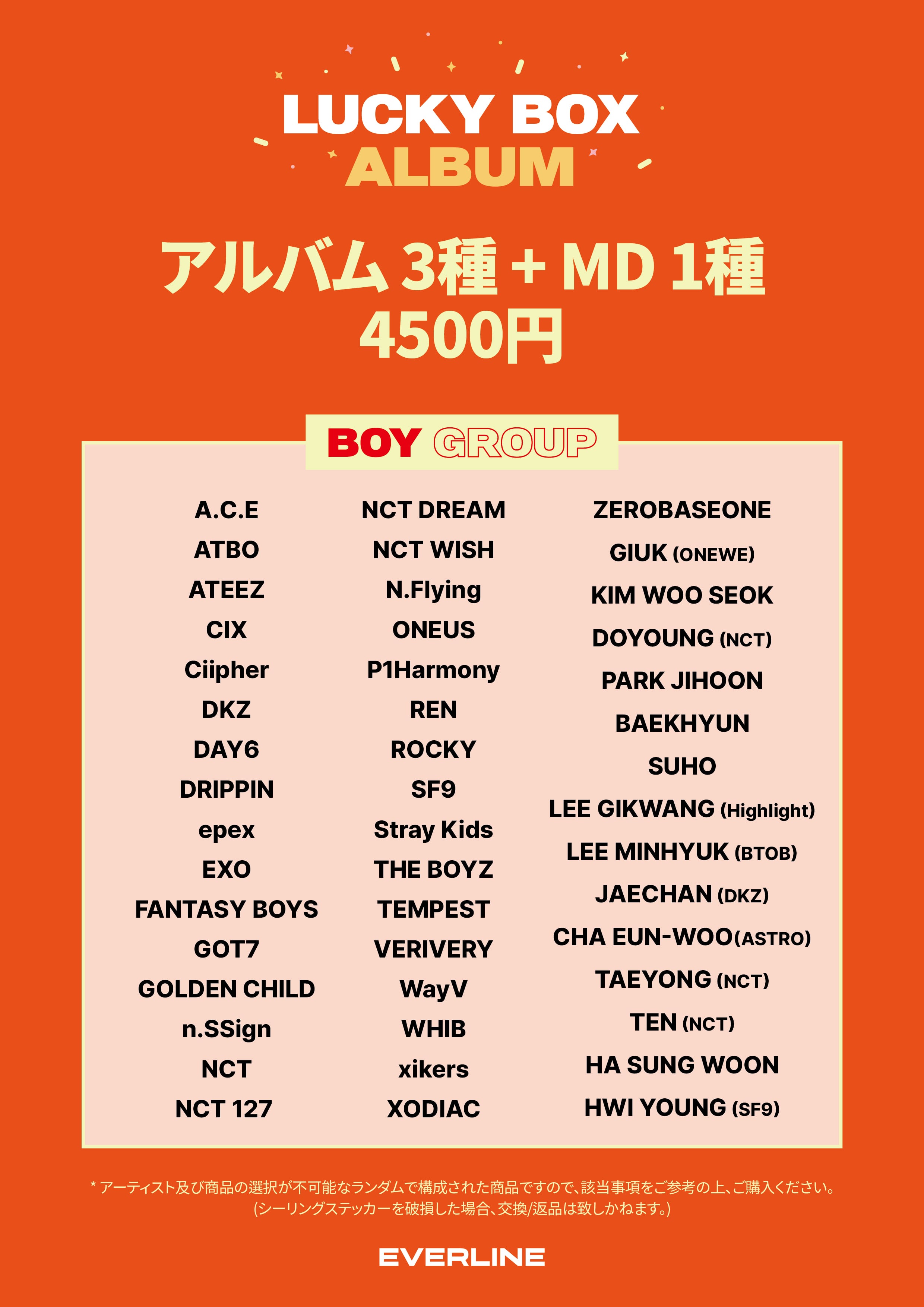 ※グッズラッキーボックスとアルバムラッキーボックスには<アルバム3種類+グッズ1種類>が入っています。イメージの中のグループのもので、ランダムで入っています。アーティストや商品の指定や選択はできません。